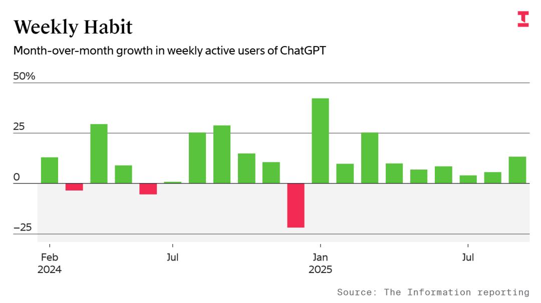 过去一年里,ChatGPT的周活跃增长出现多次波动,2025年初甚至经历明显下滑