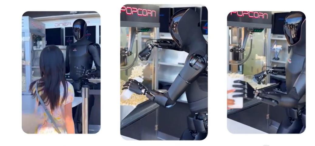 根据视频回顾,在今年5月Optimus便已展示了初步的肢体协调能力,不仅掌握了舞蹈动作,还在尝试多种舞姿的过程中,同步进行人类日常劳动工作的学习,例如整理衣物和处理垃圾,显示出其算法在通用任务上的泛化潜力。到了9月,外观设计优化得更加精简,并开始在特斯拉Diner场景中实地“打工”,完成了制作爆米花并与儿童合影互动的服务测试,验证了其在人机交互环境下的安全性。