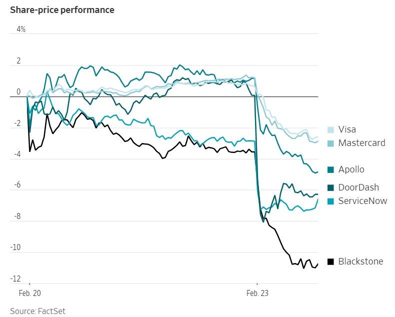 影响力更是不容小觑,文章里面可汗大点兵,点到的公司比如金融领域的 Visa,送外卖的 DoorDash,做 SaaS 的 Service Now 等,股价纷纷大跳水。