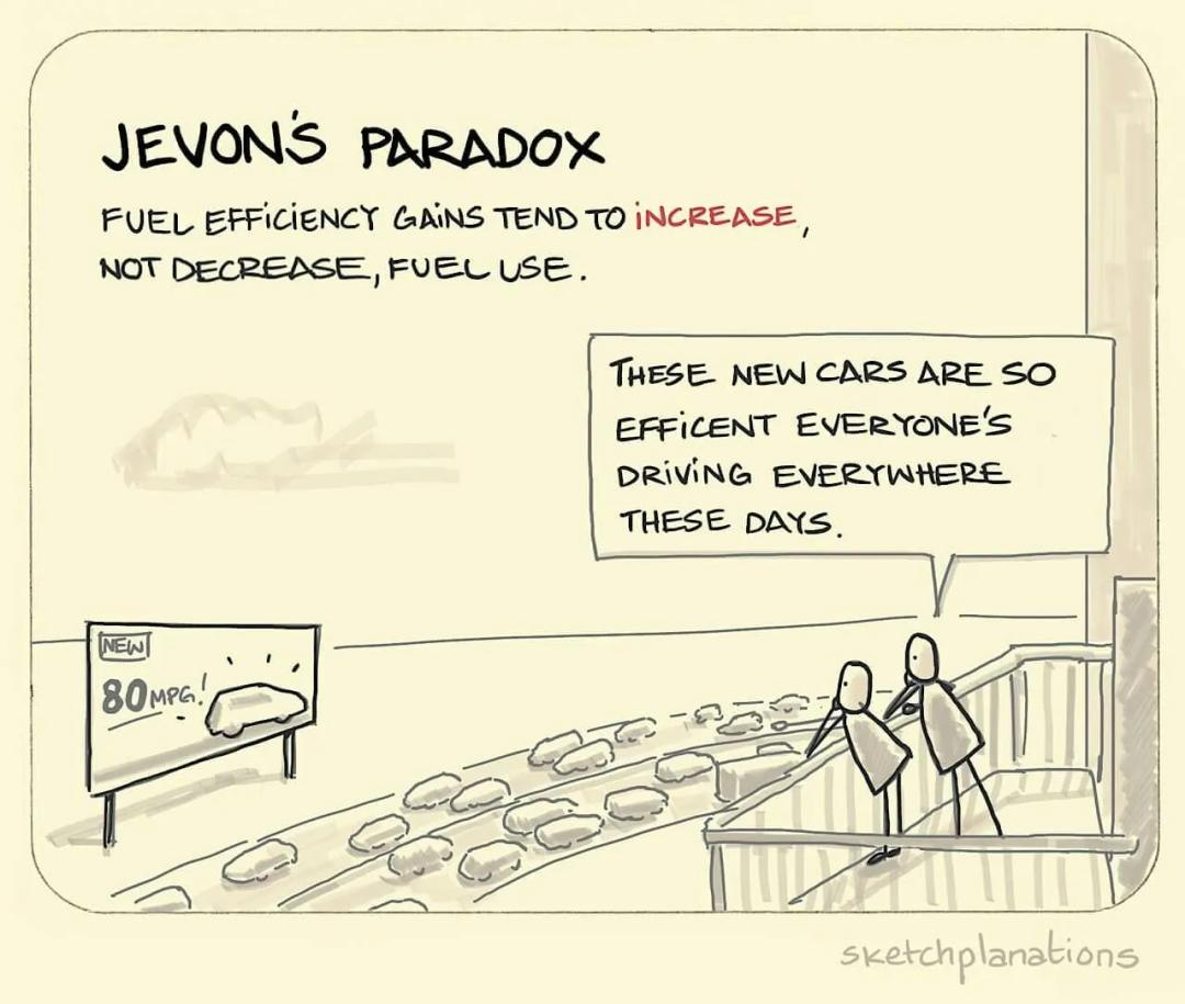 但经济史里有个老熟人,叫 William Stanley Jevons。他提出的 “ 杰文斯悖论 ” 说得很直白:当某种资源变得更高效、更便宜,消耗量往往不降反升。