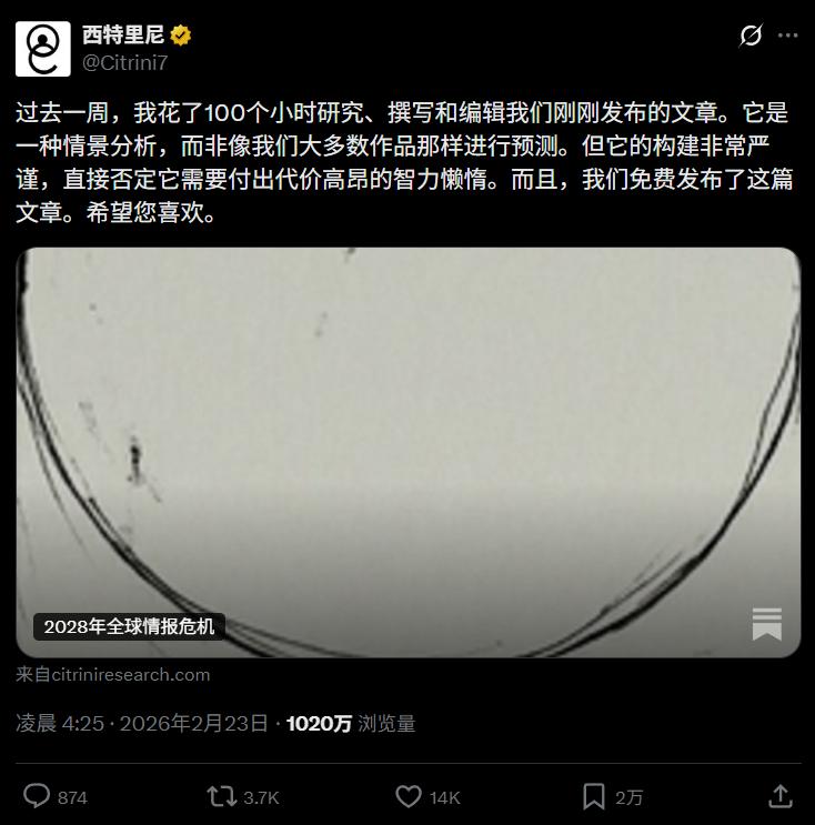 前几天,美国的独立金融研究机构 CitriniResearch 发布了一篇《 2028 年全球智能危机 》 报告。