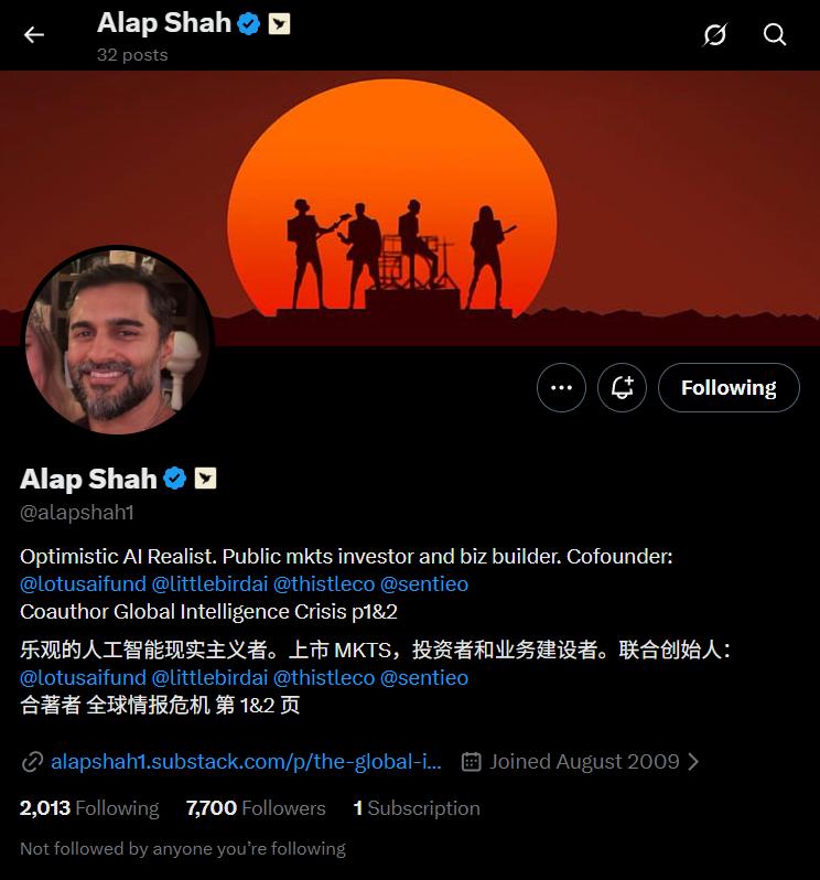 《 2028 年全球智能危机 》的创作者之一 Alap Shah ,就在社交媒体表示,报告不一定完美。