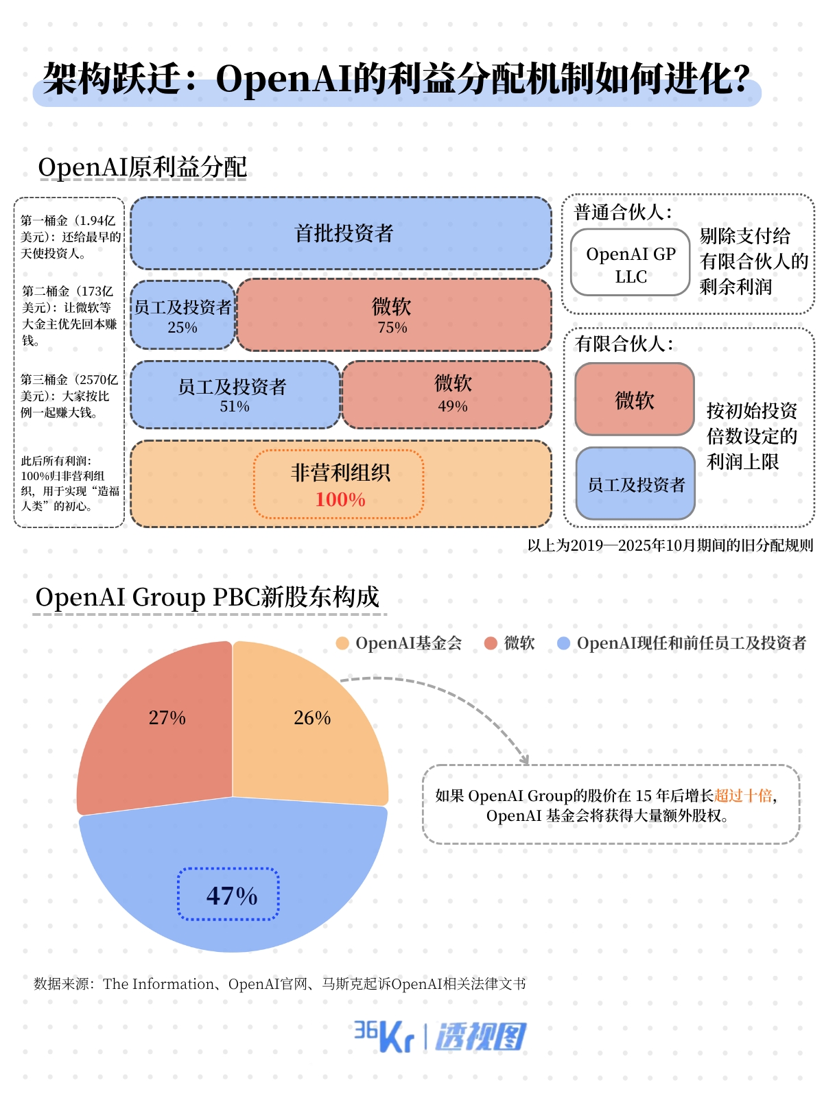 原先的非营利主体OpenAl Inc.更名为OpenAI基金会;营利主体由OpenAI Global, LLC更换为公众利益公司OpenAI Group PBC。同时股权结构大幅简化,由从前的多层级嵌套,转为OpenAI基金会、微软、其他投资者、员工直接持股。