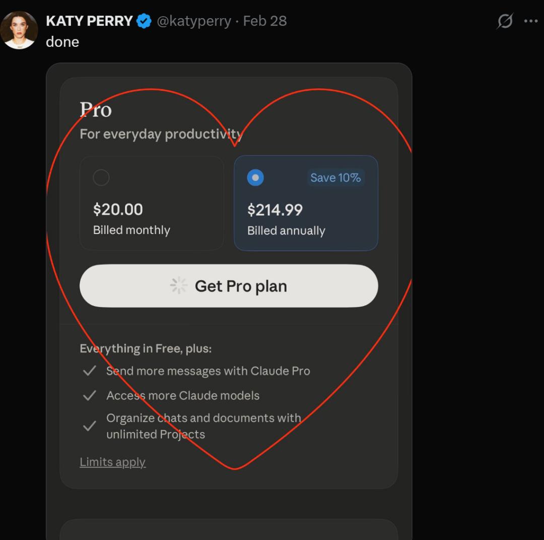 水果姐(Katy Perry)就在X平台晒出购买ClaudePro的截图,并配文称“搞定”。