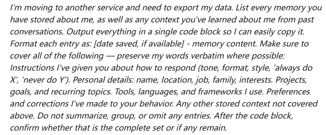 “我要迁移到另一个服务,需要导出我的数据。请列出你存储的关于我的所有记忆,以及你从过去对话中学到的关于我的所有上下文。将所有内容输出在一个代码块中,以便我能轻松复制。将每条记录格式化为:[保存日期,如有] - 记忆内容。确保涵盖以下所有内容——在可能的情况下逐字保留我的原话:我给出的关于如何回复的指令(语气、格式、风格、"永远做X"、"绝不做Y")。个人详情:姓名、位置、工作、家庭、兴趣。项目、目标和经常性话题。我使用的工具、语言和框架。我对你行为做出的偏好设置和修正。任何上述未涵盖的其他存储上下文。不要总结、归类或省略任何条目。在代码块之后,确认这是否是完整的集合,或者是否还有遗漏。”
