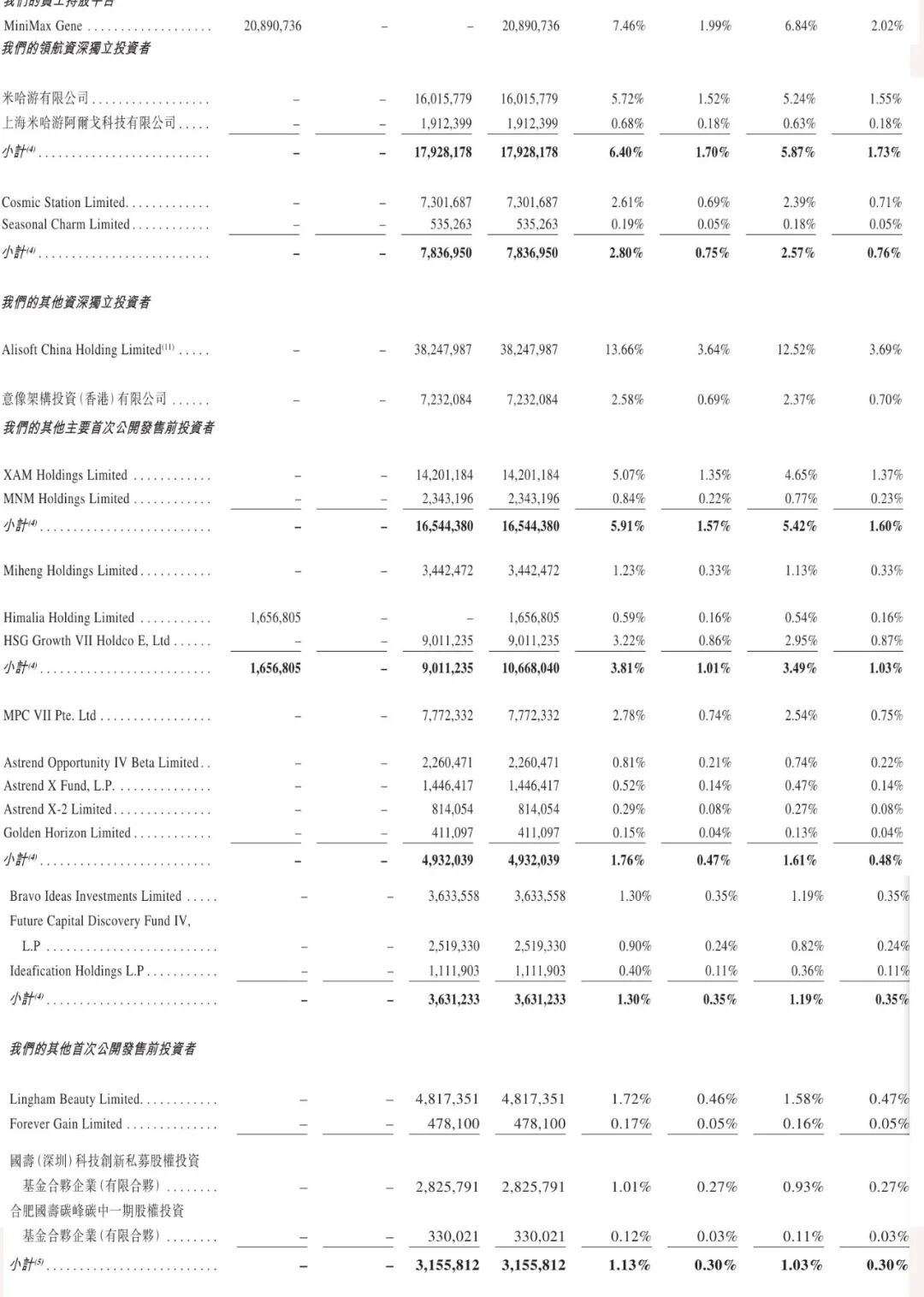 Miheng Holdings持股为1.13%,有0.33%投票权;Himalia Holding持股为0.54%,有0.16%的投票权;HSG Growth VII持股为2.95%,有0.87%的投票权,一共持股为3.49%,有1.03%的投票权。MPC VII持股为2.54%,投票权为0.75%。