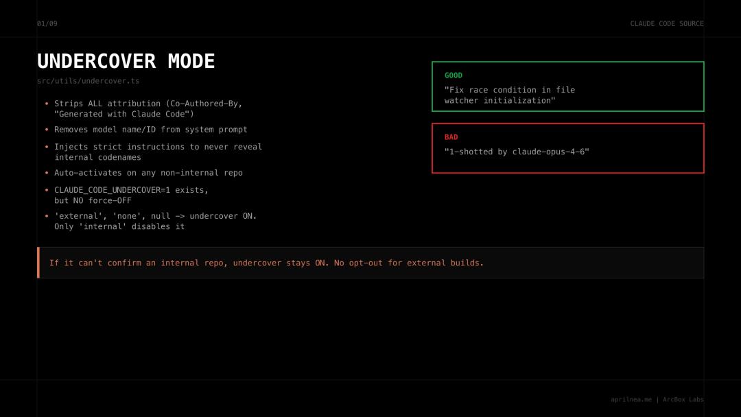 讽刺的是,泄露的代码中有一个叫「Undercover Mode」的子系统。专门用来防止Anthropic员工在公开仓库操作时泄露内部信息。