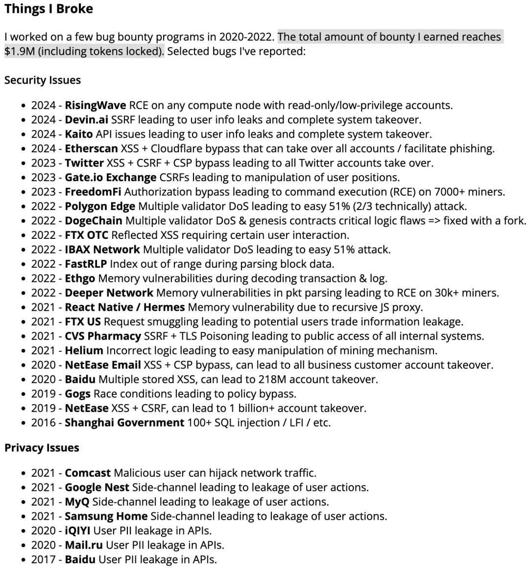 他的个人主页上有一个叫「Things I Broke」的栏目,密密麻麻排了三十多条记录,读起来像一份硅谷安全圈的「通缉名单」,只不过角色反过来了,被通缉的是那些漏洞。
