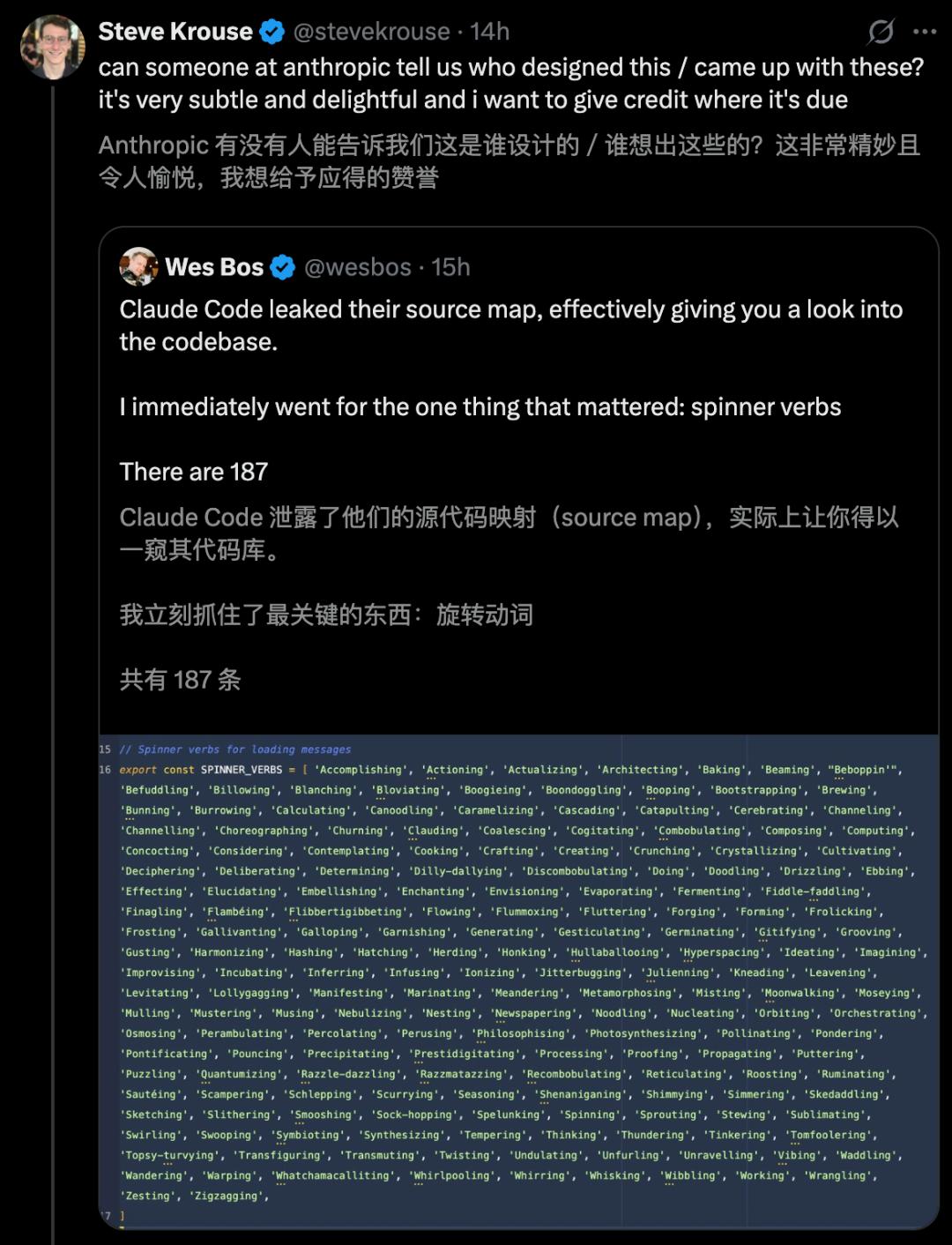 有人从源码中,意外发现了一个叫SPINNER_VERBS的常量,列表中塞进了整整187个等待加载的动词。