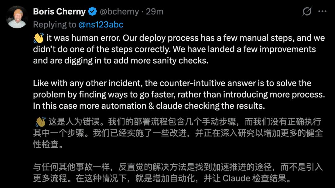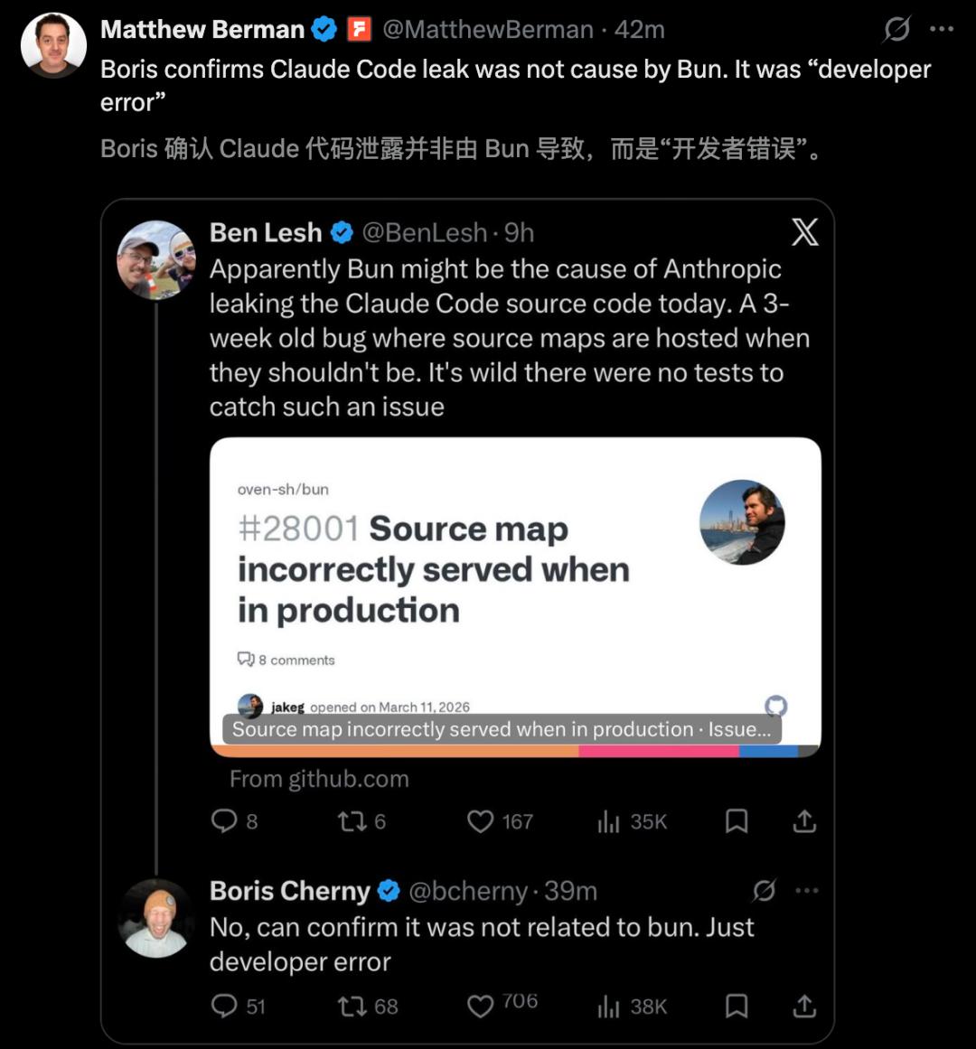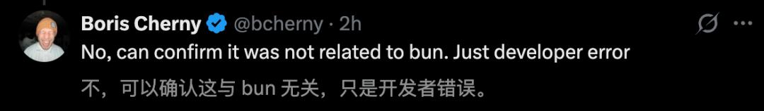 但就在刚刚,Claude Code之父Boris Cherny现身回应,这和Bun无关,仅是开发者的一个错误。
