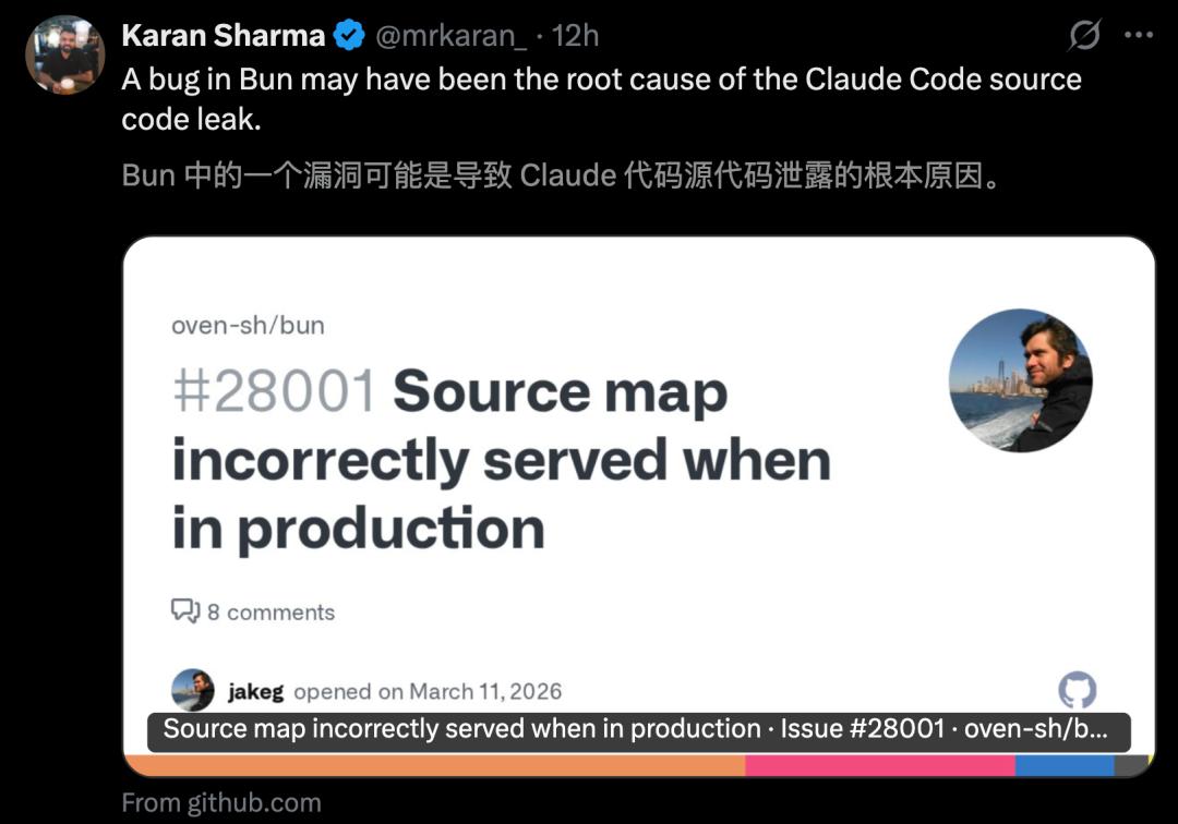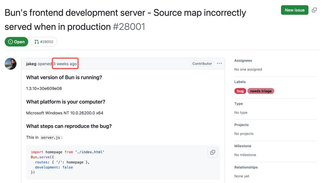 这个bug在3月11日就被人在GitHub上报了,编号#28001,反映的问题是Bun在生产模式下依然会输出source map。三周过去了,issue仍然是open状态。
