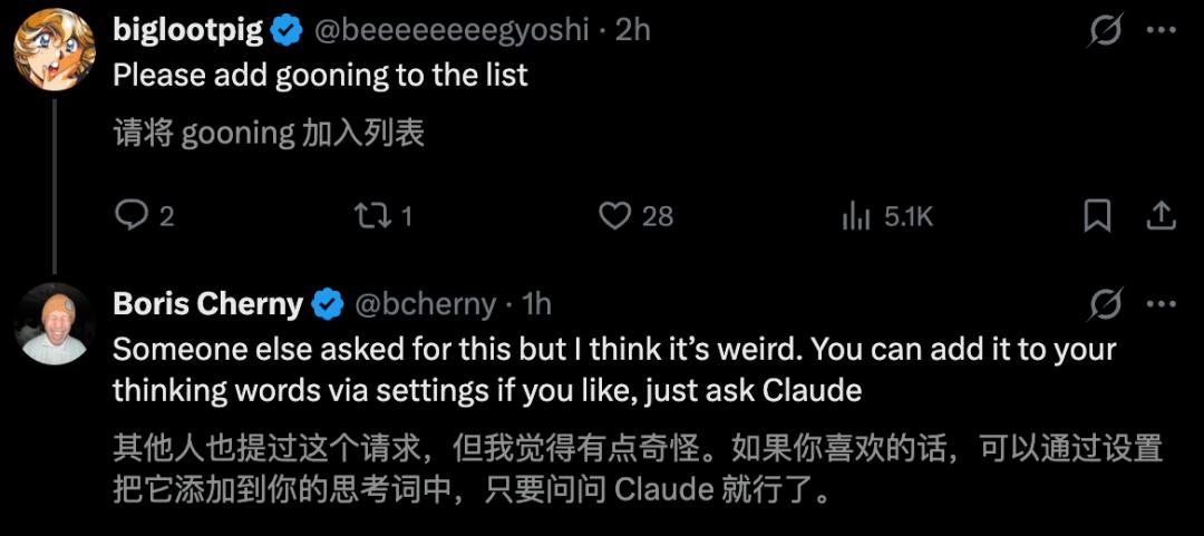 Boris幽默地拒绝了,并调侃道「虽然我觉得这很奇怪,但如果你真想要,可以去设置里让Claude自己想」。