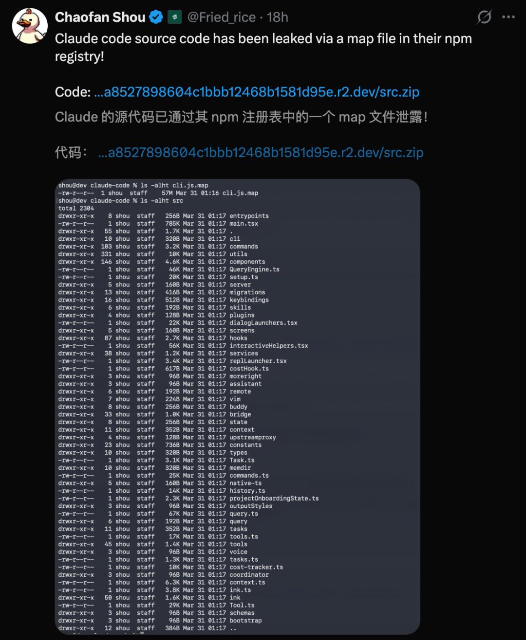 3月31日凌晨4点23分,安全研究员Chaofan Shou在X上甩出一句话——