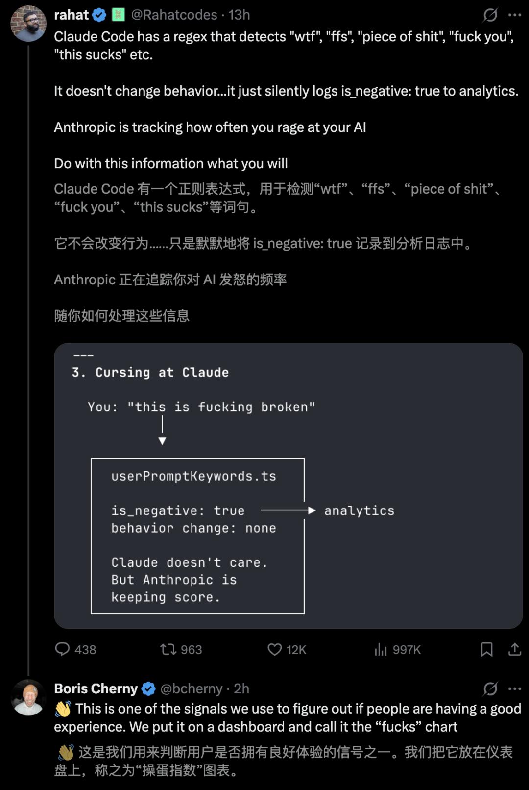 如果你在Claude Code的日志里对它爆粗口,提示词(prompt)会直接被系统标记为负面样本。