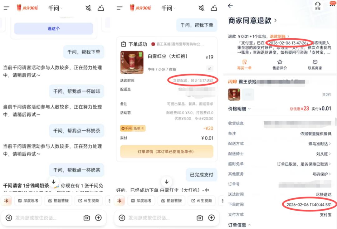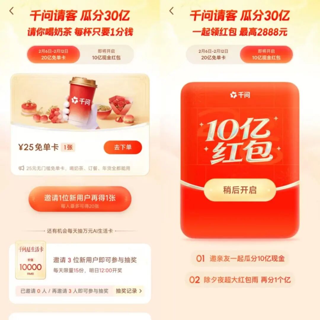 2月6日,阿里千问“春节30亿免单”活动第一天,以0.01元的诚意价格,邀请全国人民用AI一句话免费点奶茶,掀起了新一轮“AI外卖大战”。