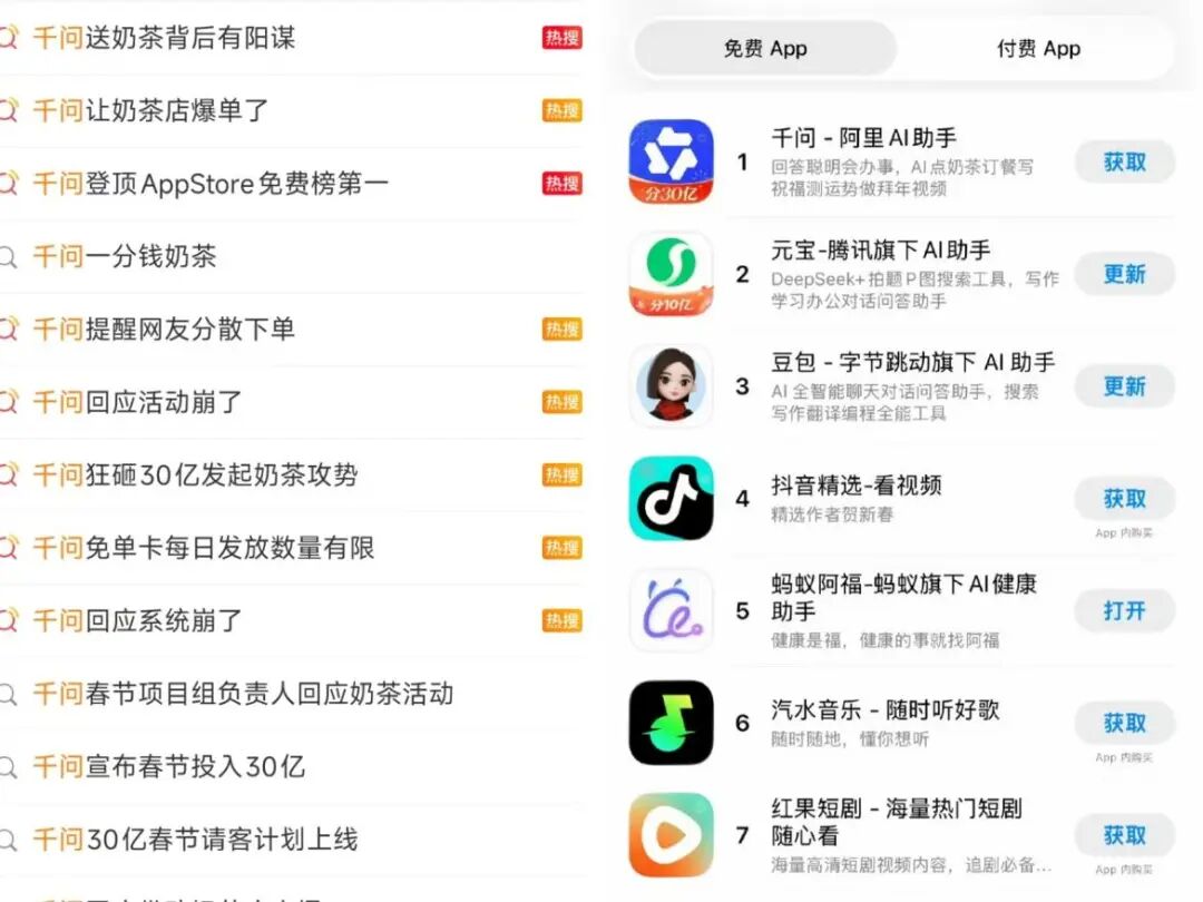 根据千问官方数据显示,该活动上线9个小时,订单量超过了1000万单。霸榜多个微博热搜同时,千问APP一度登顶AppStore免费下载榜榜首,超过前两天狂撒10亿红包的腾讯元宝。
