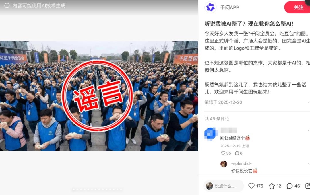 除了主动布局娱乐营销,千问还善于借梗营销,将负面舆情转化为流量红利。2025年年末,网络流传“千问大会手撕豆包”的AI梗图,引发大众热议。千问官方快速辟谣,明确表示梗图由自身生图功能制作,既澄清了事实,又成功推广了生图功能,实现流量与口碑的双重收获。