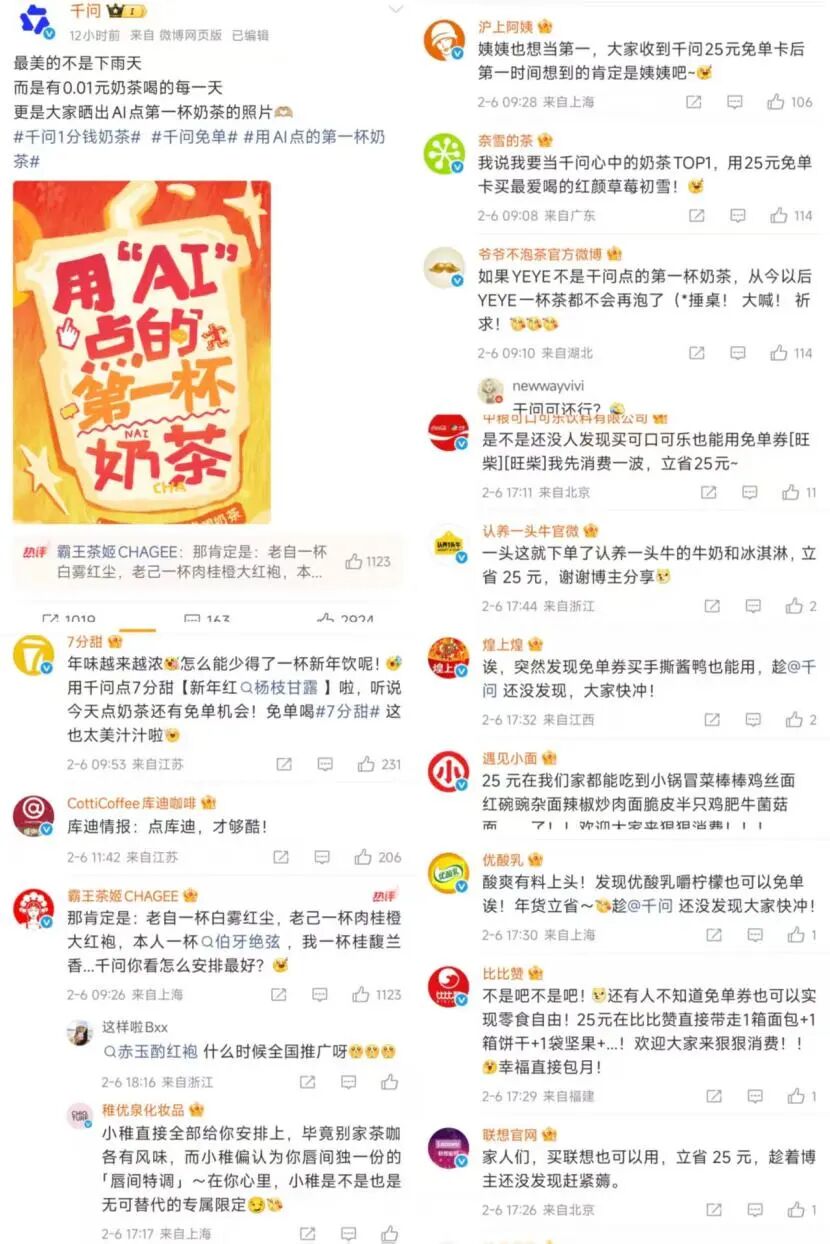而在千问官方微博的下方,更是引发各大茶饮消费品品牌方排队打广告。