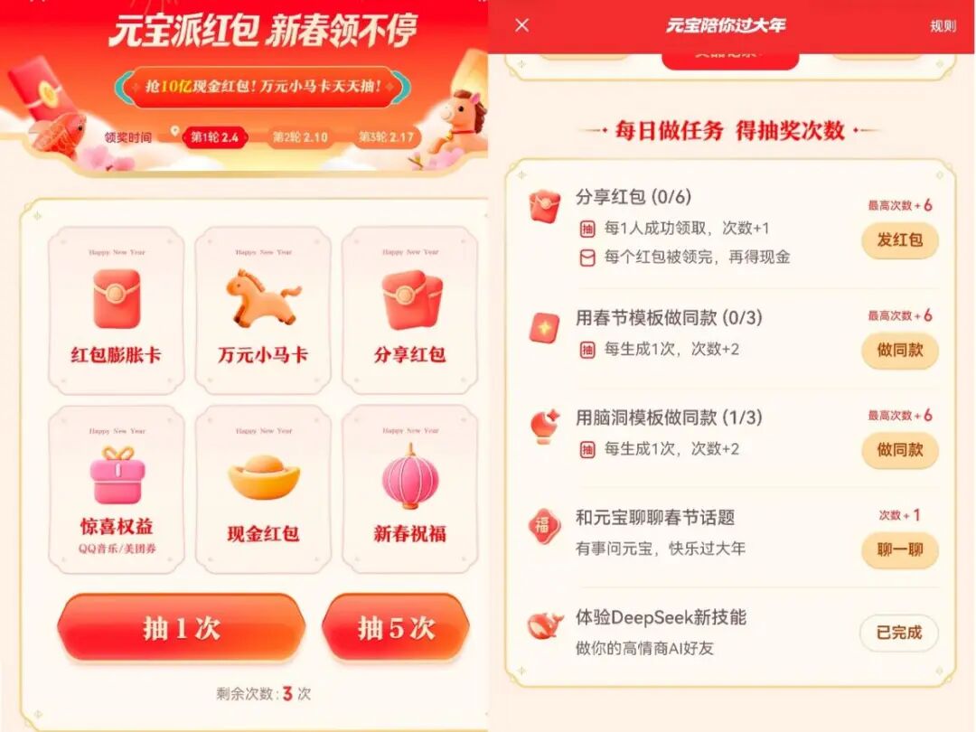 2 月初,腾讯元宝以 10 亿红包切入微信社交场景,采用 “分享抽奖、邀友加码” 的裂变玩法,试图复刻当年微信红包的传播效应。