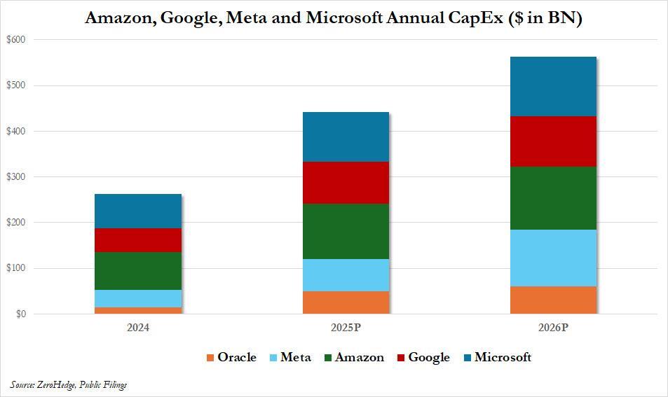 从占美国GDP比例来看,这一规模已经超过了上世纪60年代的“阿波罗登月计划”和70年代的“州际高速公路系统”,仅次于1803年的“路易斯安那购地案”。仅亚马逊一家,就计划今年将资本支出增加近60%至2000亿美元。
