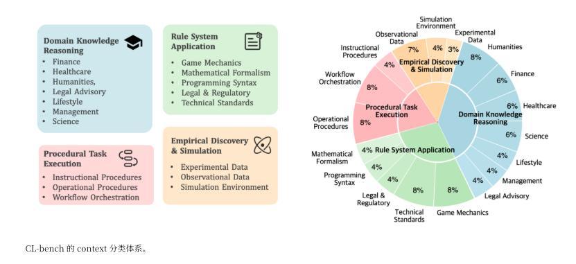 这就是混元团队这次建设 CL-bench 在干的事情。他们构建了近 2000 个从未在互联网上公开过的、由专家精心构造的「全新情境」,有虚构的法律体系,新的编程语言语法等等。