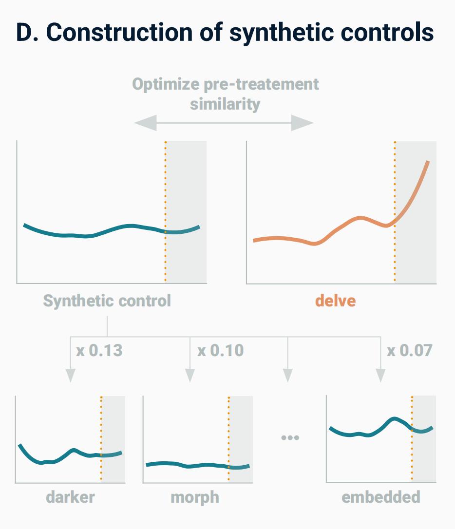 为了理清这种可能性,研究人员用了计量经济学中的「合成控制法」。他们利用大数据构建了一个「没有 AI 发布」的平行宇宙模型。在那个虚拟世界里,人类语言按照过去的演变逻辑缓慢进化——Delve 这些的使用率,平稳得如同常年没有波动的 A 股市场(不是)。