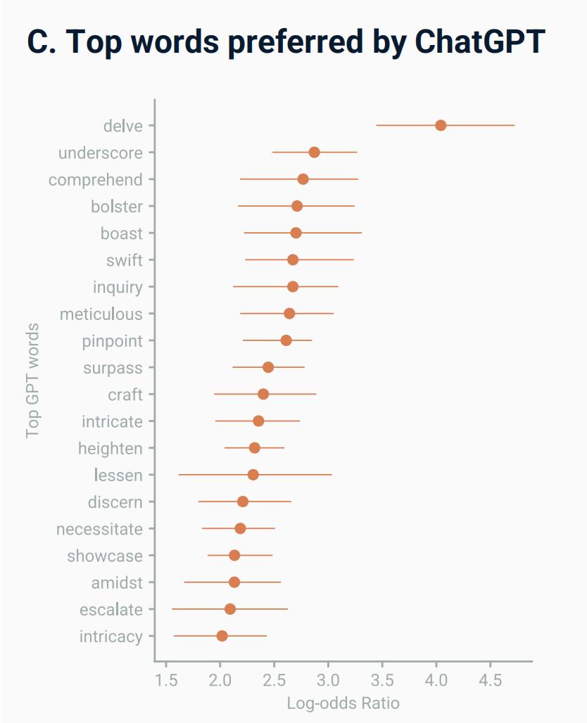 而在现实宇宙中,这些词的暴涨与技术发布的时间点完美契合,这就让 AI 作为语言习惯改变的主要因素,显得更有说服力了。