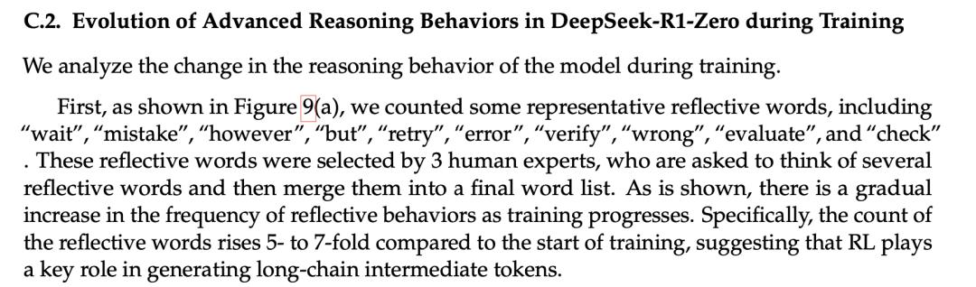 先挑了一批具有代表性的反思性词汇,比如「wait」「mistake」「however」等,由几位人工专家筛选、合并成一份最终词表,然后统计这些词在训练过程中出现的频率。