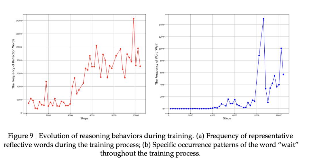 结果显示,随着训练推进,这些反思性词汇的出现次数,相比训练初期直接涨了大约5到7倍。