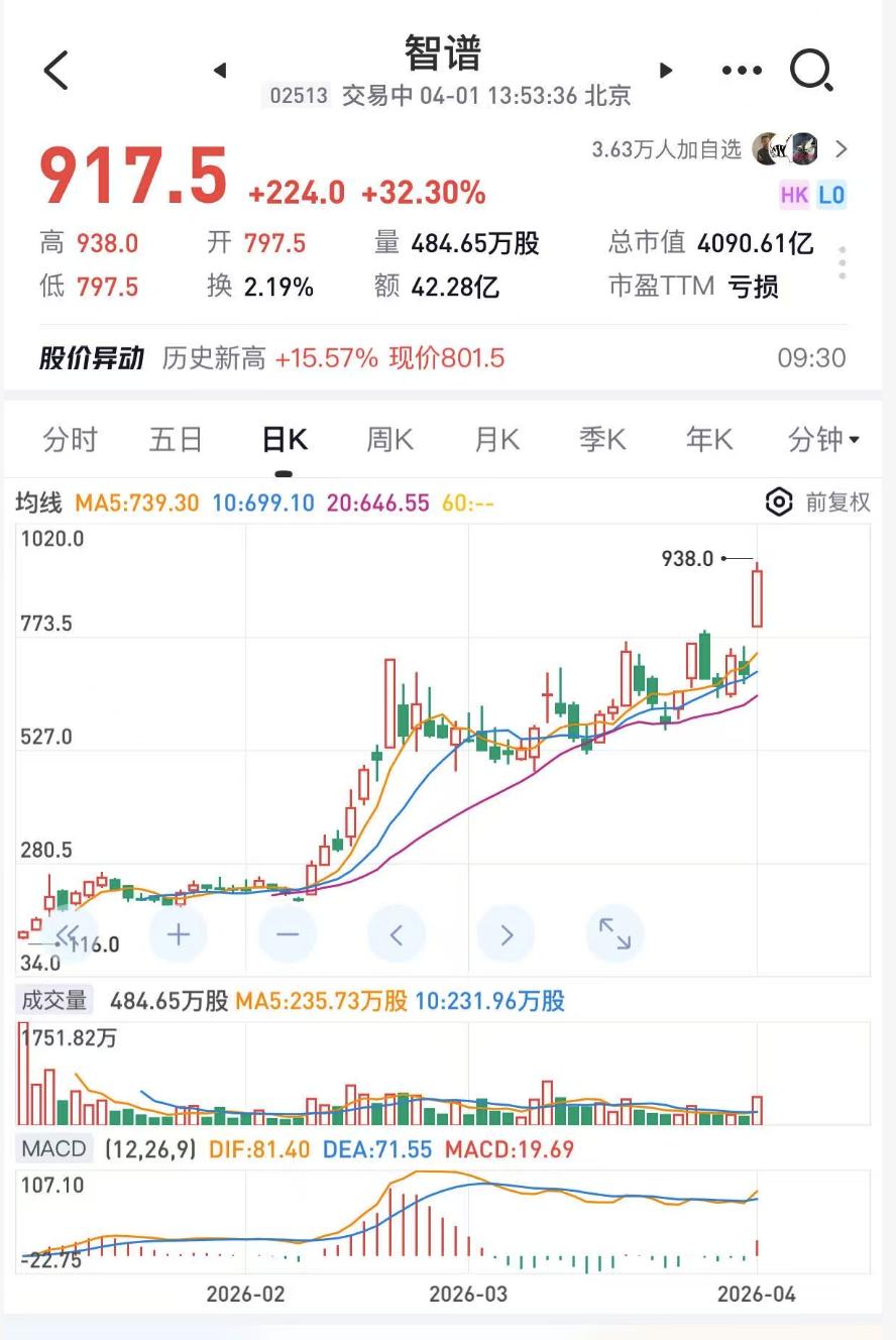 2026年1月8日,智谱以“全球大模型第一股”身份在港交所挂牌,发行价116.2港元,对应市值约520亿港元。香港公开发售超额认购1159倍。截至4月1日,智谱股价一度飙升至917港元,市值超过4000亿港元,超过百度、京东、快手。