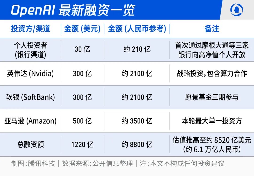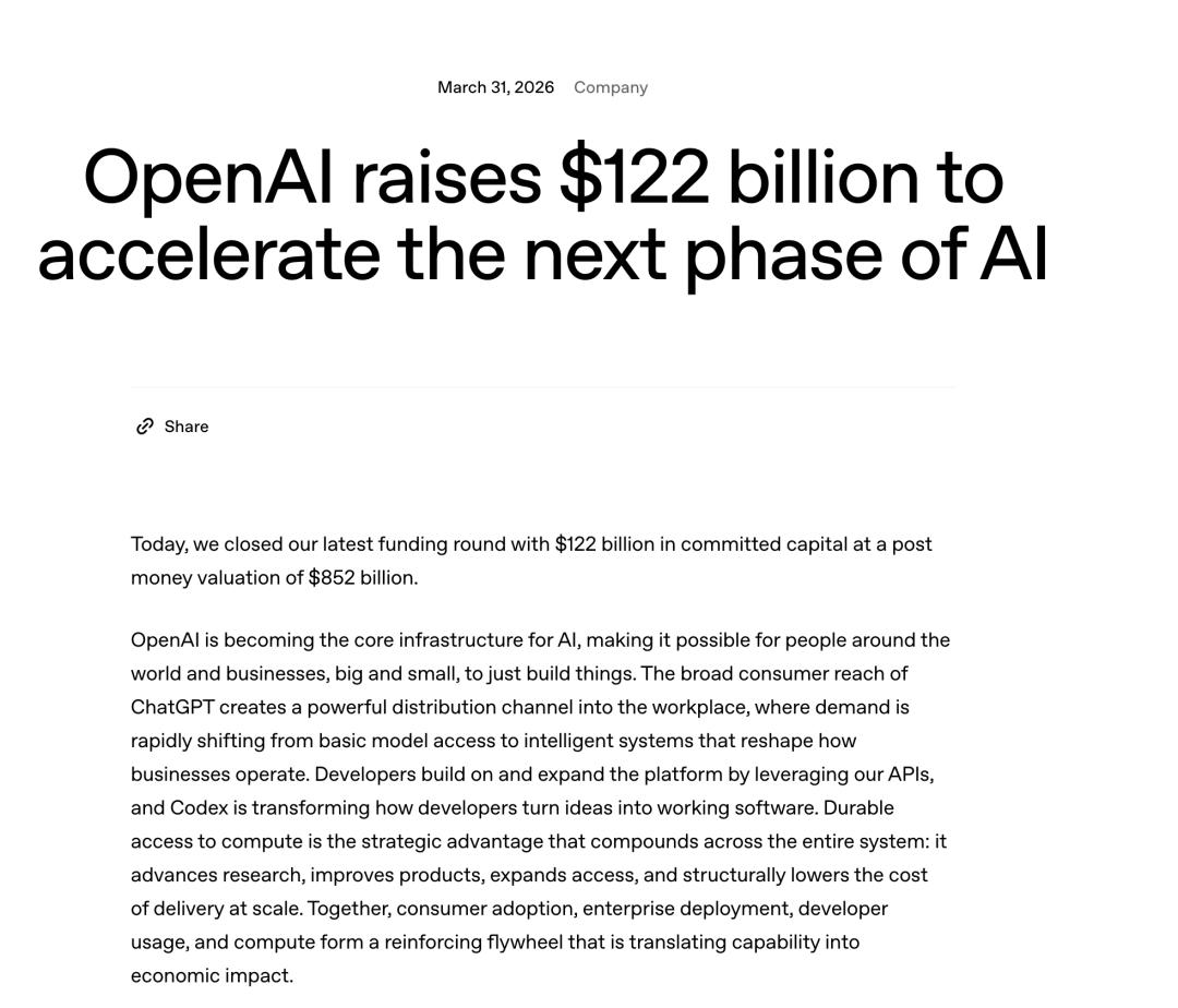 2026年3月31日,OpenAI宣布以8520亿美元的投后估值关闭其最新一轮融资,总承诺资本达到1220亿美元。这是这是硅谷史上最大规模的融资之一。同一天,OpenAI首次通过银行渠道向个人投资者出售了约30亿美元的股份,并宣布其股票将被纳入Cathie Wood旗下ARK Invest管理的多只ETF。