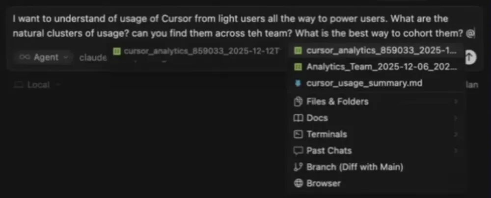 我一开始很简单:我想理解 Cursor 的使用情况。我已经知道团队里从轻度用户到重度用户都有。我特别想搞清楚的是:使用行为有没有天然的“聚类”?能不能在团队里找出这些群体?怎么做分组(cohort)最合理?我就把这个标准 analytics 文件丢进来,用 Curosr 进行分析。