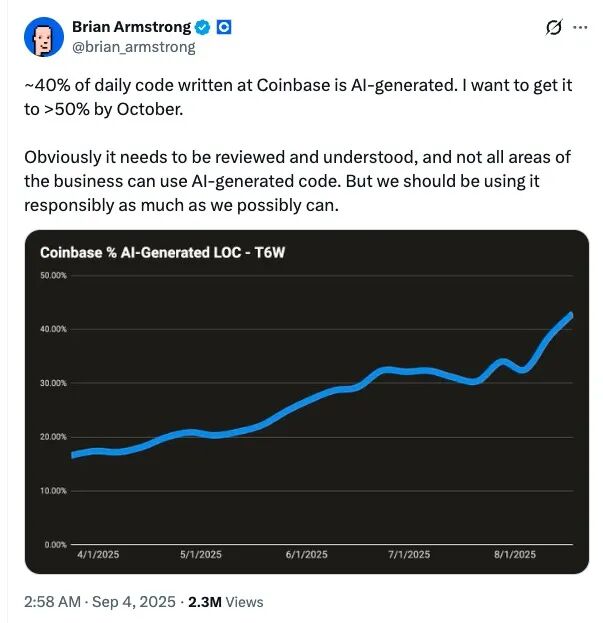 一个月后,Armstrong 的激进又达到了新的程度:他在 X 上公开表示,Coinbase 目前约 40% 的日常代码已经由 AI 生成,而他的目标是在 30 天内把这个比例推到 50% 以上。