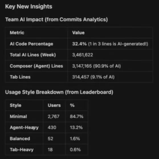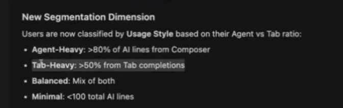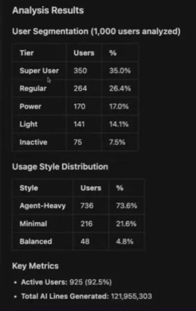 跑完后,它给了我一些高层指标(比如 AI 生成占比、每周 AI 行数、agent/composer 生成行数、tab 补全行数),更重要的是它做出了更“行为导向”的分群:一类是 agent-heavy,很多任务直接交给 agent;一类是 tab-heavy,主要靠 tab 补全,更偏“自己掌控”;还有 balanced,两边都用;以及 cursor curious——装了但用得少、还在观望、还没真正进入“LLM 工作流”的人。