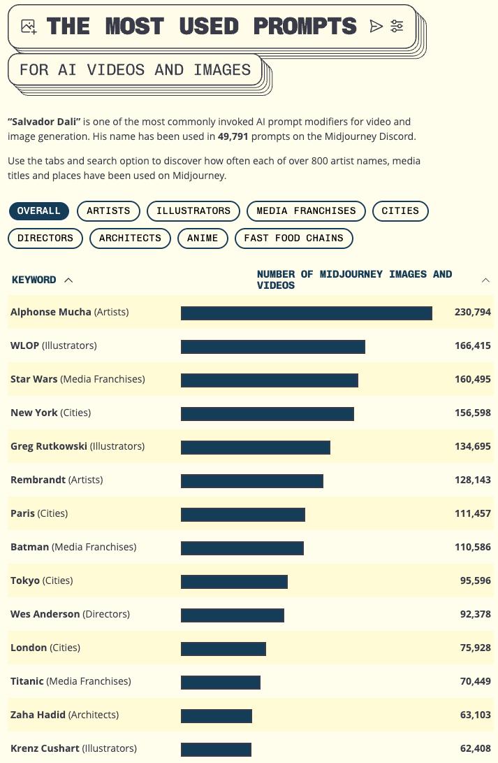 结果显示:Midjourney 用户引用最多的是 Art Nouveau 画家 Alphonse Mucha(23万次)、电影导演 Wes Anderson(9.2万次)、建筑师 Zaha Hadid(6.3万次)。品牌内容同样活跃—仅 McDonald's 一个品牌就出现在1.8万条 prompt 中。