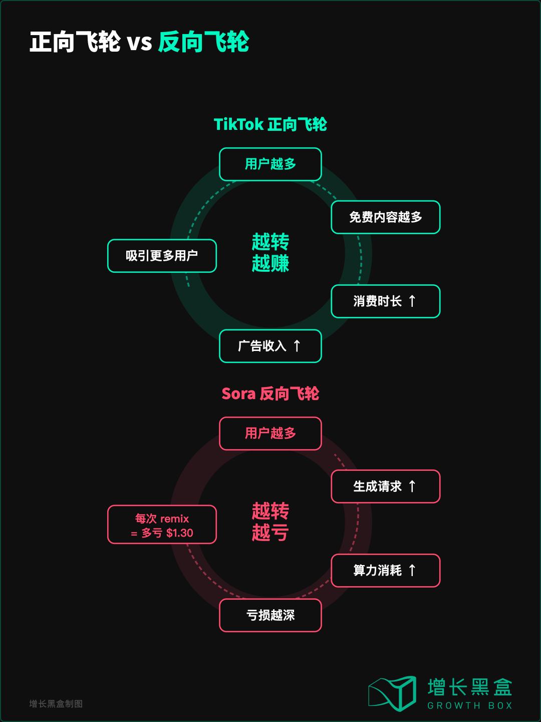 Sora 的飞轮是反着转的。AI 视频生成的边际成本极高,而且目前看不到大幅下降的路径。用户越多 → 生成请求越多 → 算力消耗越大 → 亏损越深。