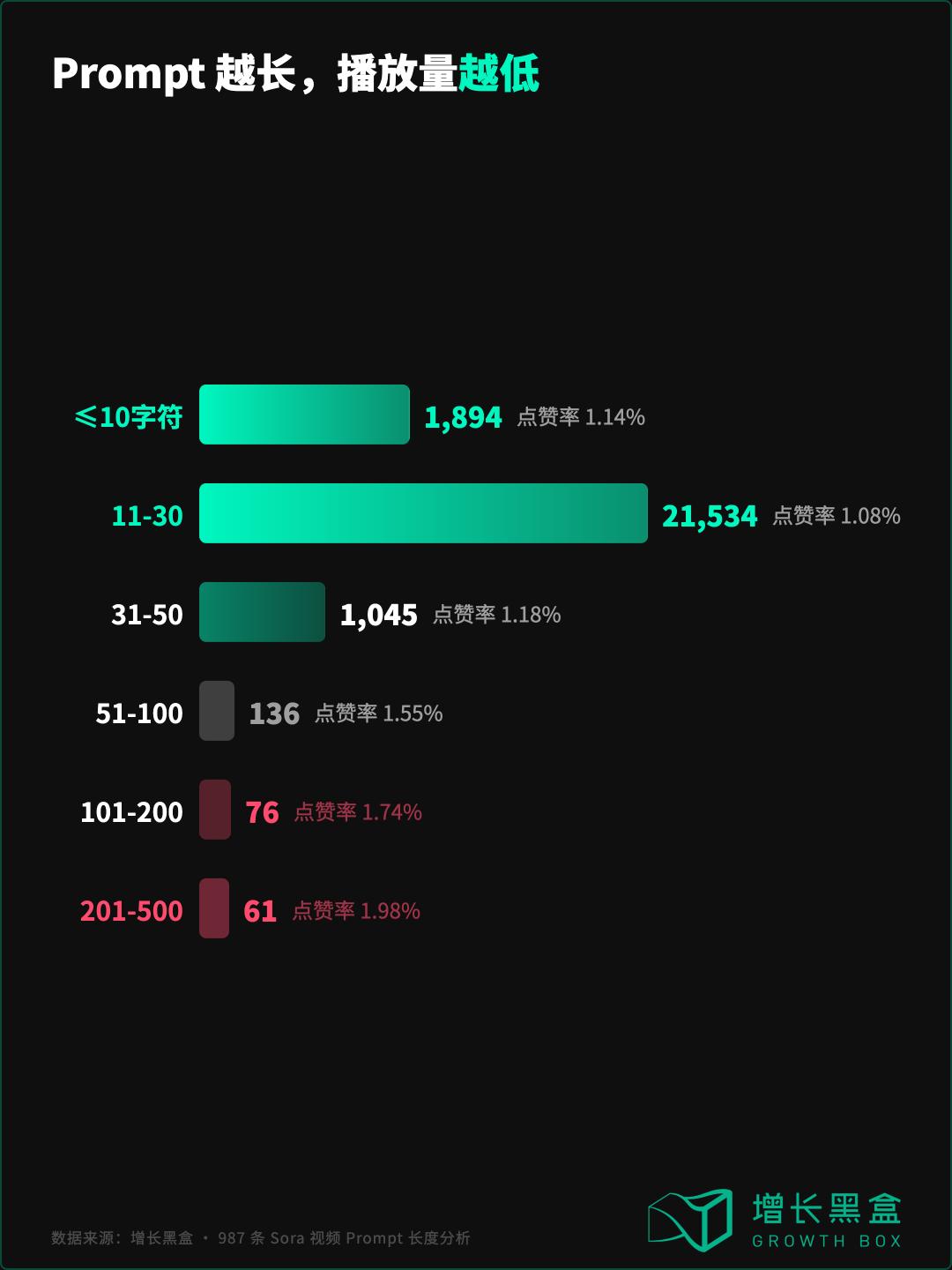 ≤10字符的 prompt,中位播放量 1,894;201-500字符的 prompt,中位播放量 61。短 prompt 的中位播放量是长 prompt 的31倍。