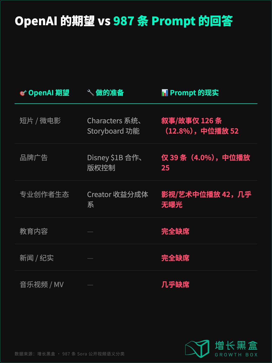 2025年9至10月,Sora 2 用户增长最迅猛的时期,增长黑盒以上千个全球高热度话题和社交媒体关键词为种子,在 Sora 平台上进行了系统性的内容抽样。经过去重和清洗,得到了987 条独立视频,每一条都附带完整的 prompt 原文、播放量、点赞数、remix 次数等互动数据。