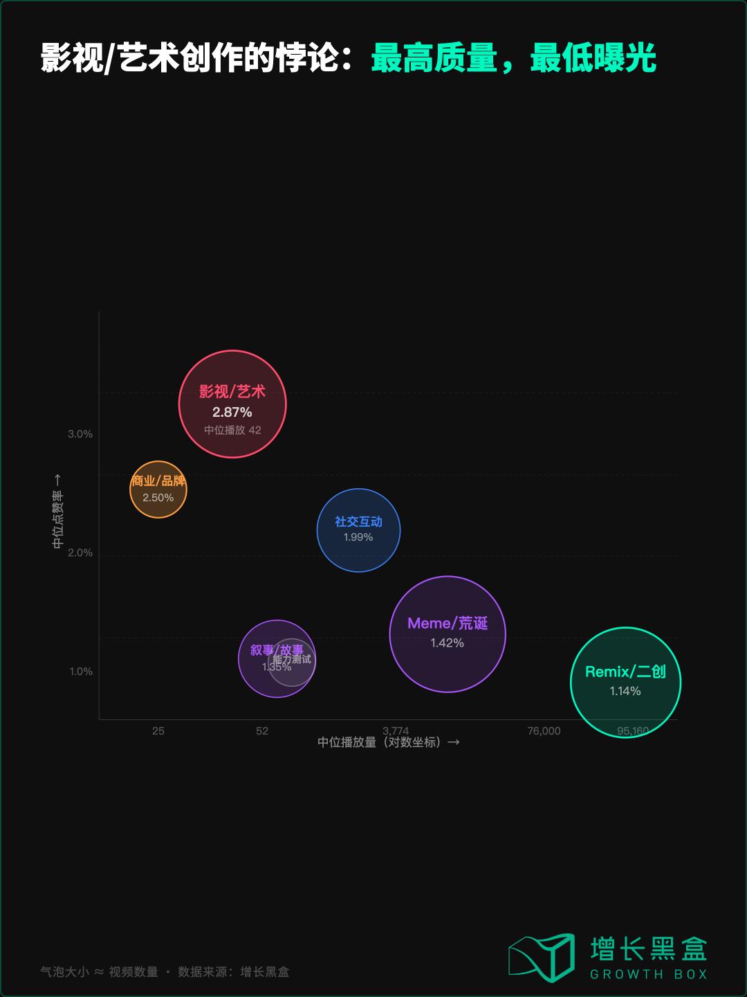 不是。影视/艺术类有252条,占总量四分之一。但它们的处境极其矛盾:影视/艺术类中位点赞率2.87%,调研样本中最高—远高于 Remix(1.14%)和 Meme(1.42%)。看到的人认可质量。但中位播放量只有42次,调研样本中最低,71.8%不到数据集中位数。