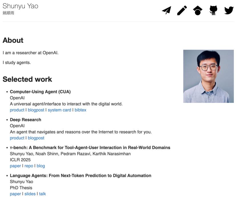 《财经》了解到,Vincesyao的实名是姚顺雨,他是OpenAI前研究员。姚顺雨出生于1998年,本科毕业于清华大学姚班(清华学堂计算机科学实验班),后进入普林斯顿大学攻读博士学位。2024年8月,姚顺雨加入OpenAI,参与了Operator与Deep Research这两款智能体产品的开发。他的智能体相关学术研究,也为OpenAI的智能体业务起到了基础贡献。