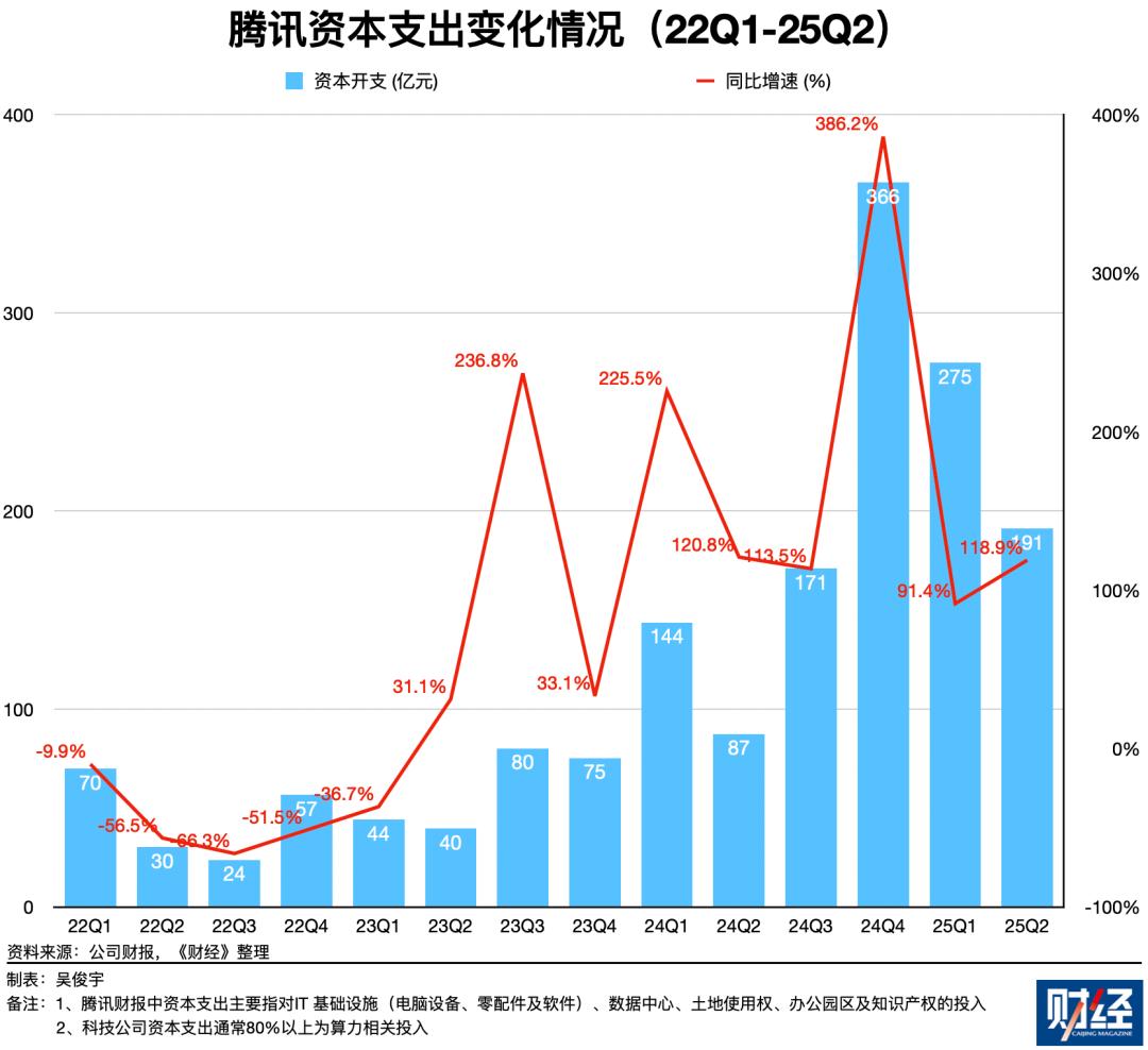 腾讯财报显示,2024年三季度-2025年二季度,腾讯资本支出总额为1023亿元,同比增长178%。《财经》多方了解到,中国市场同期资本支出总额超过1000亿元的大型科技公司,仅有腾讯、阿里、字节跳动三家。