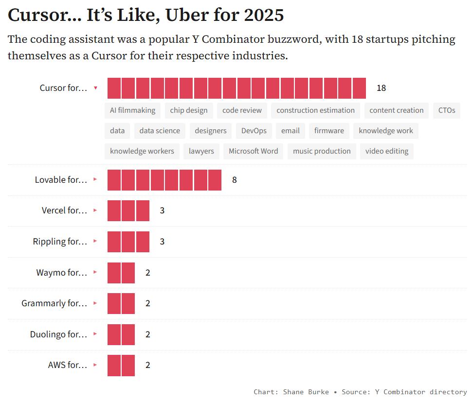 在2025年的Y Combinator创业营里,「某某行业的Uber」这种说法已经过时了,取而代之的是「某某行业的Cursor」。