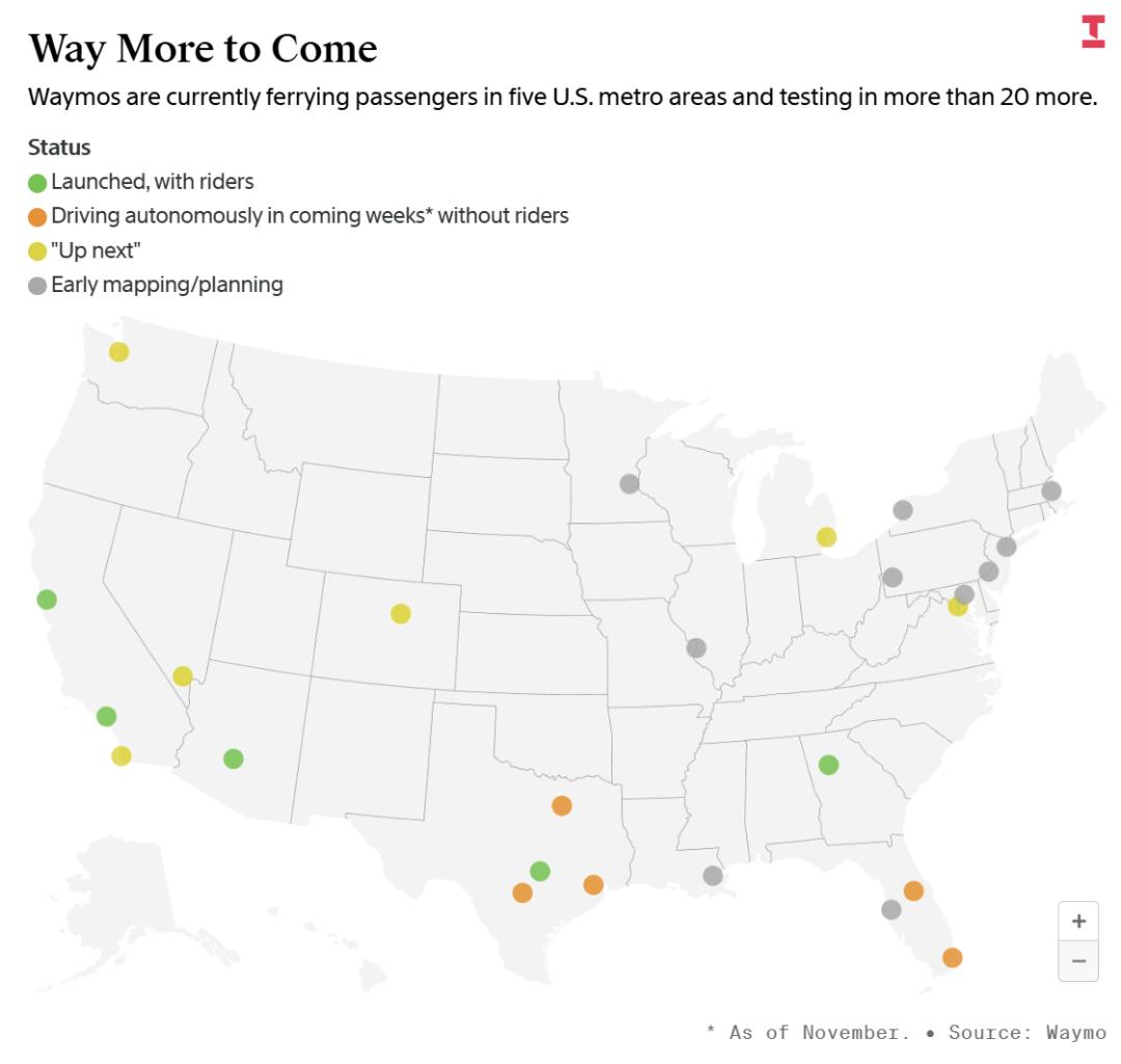 这张图标记了Waymo的扩张足迹:
