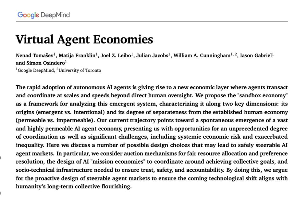 9月12日,Google DeepMind与多伦多大学研究人员发布了一篇论文《虚拟代理经济》(Virtual Agent Economies),在论文中,他们认为,一个由自主AI代理(Autonomous AI agents)构成的新经济层正在形成,它们将以超越人类理解的速度和规模进行交易与协作。
