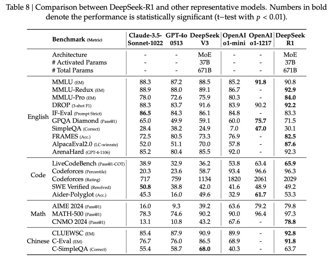 结果显示,DeepSeek R1多项实力与OpenAI o1相媲美,甚至赶超o1-mini、GPT-4o、Claude 3.5。