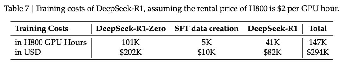 - 训练成本拆解:总计约29.4万美元(R1-Zero使用了198小时的H800GPU)