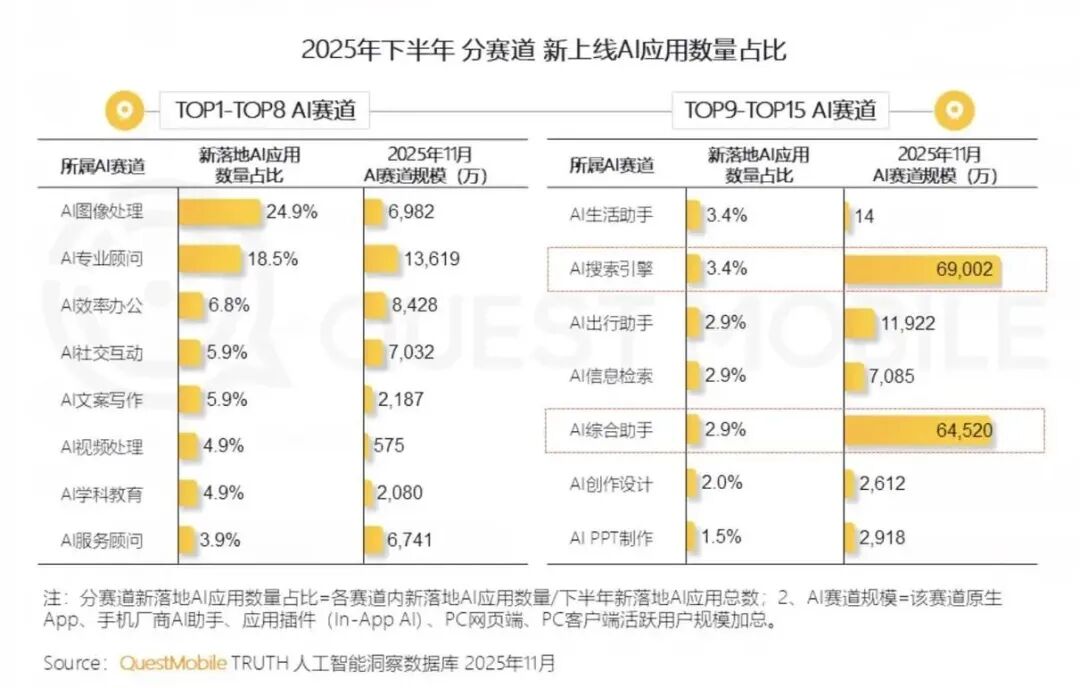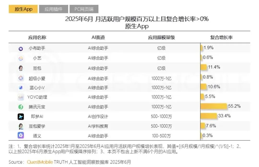 此外,从QuestMobile的数据也可以看到,AI原生App受用户欢迎程度在加深。2025年上半年,月活跃用户规模方面,AI综合助手类原生App“腾讯元宝”的复合增长率达55.2%,AI创作设计类原生App即梦AI的复合增长率是33.4%。