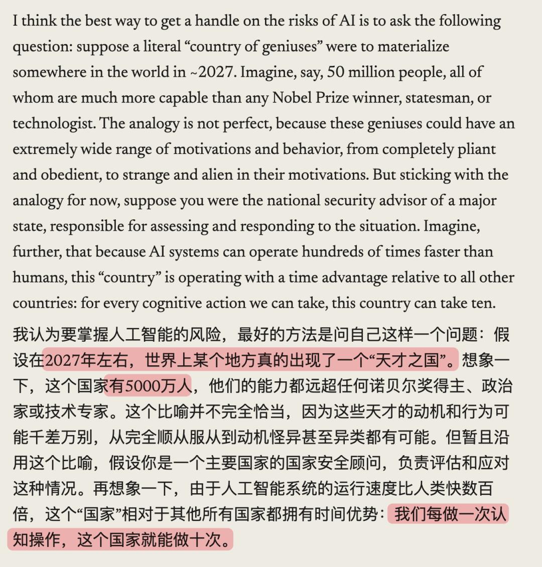 假如地球上突然冒出一个 5000 万人口的国家,这 5000 万“国民”,每一个都比诺贝尔奖得主聪明,思考速度是人类的 10 倍。他们不吃饭、不睡觉,24 小时搞编程、做研究、想方案。