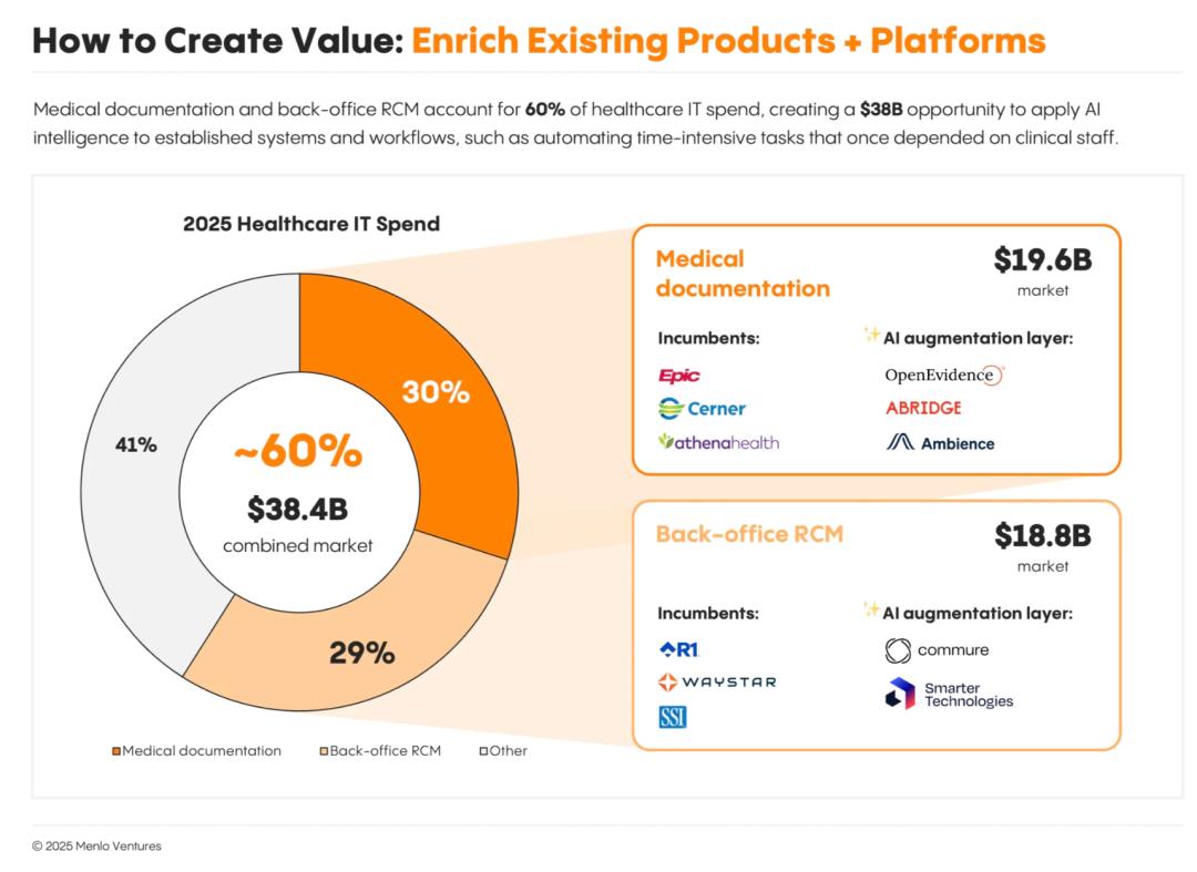 在医疗文档领域,Abridge 和 OpenEvidence,以及在后台收入周期管理(RCM)领域的 Commure 和 Smarter Technologies,正通过增强而非替代的方式,切入医疗IT市场。
