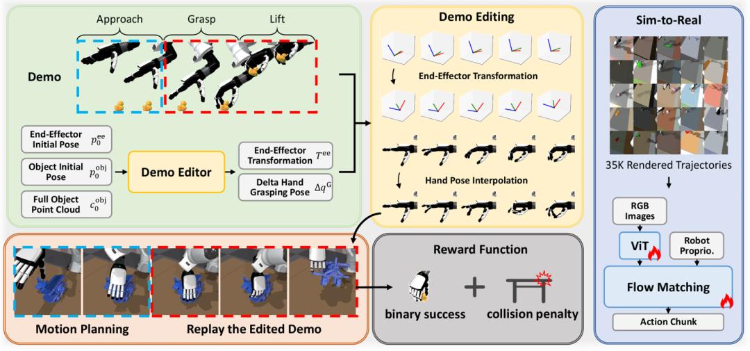 - 手指关节编辑:对手指的抓取关节角施加一个增量 Δq_G,通过与演示轨迹的等比例插值,产生一条灵巧手从初始张开姿态平滑到达新的抓取姿态的动作轨迹。